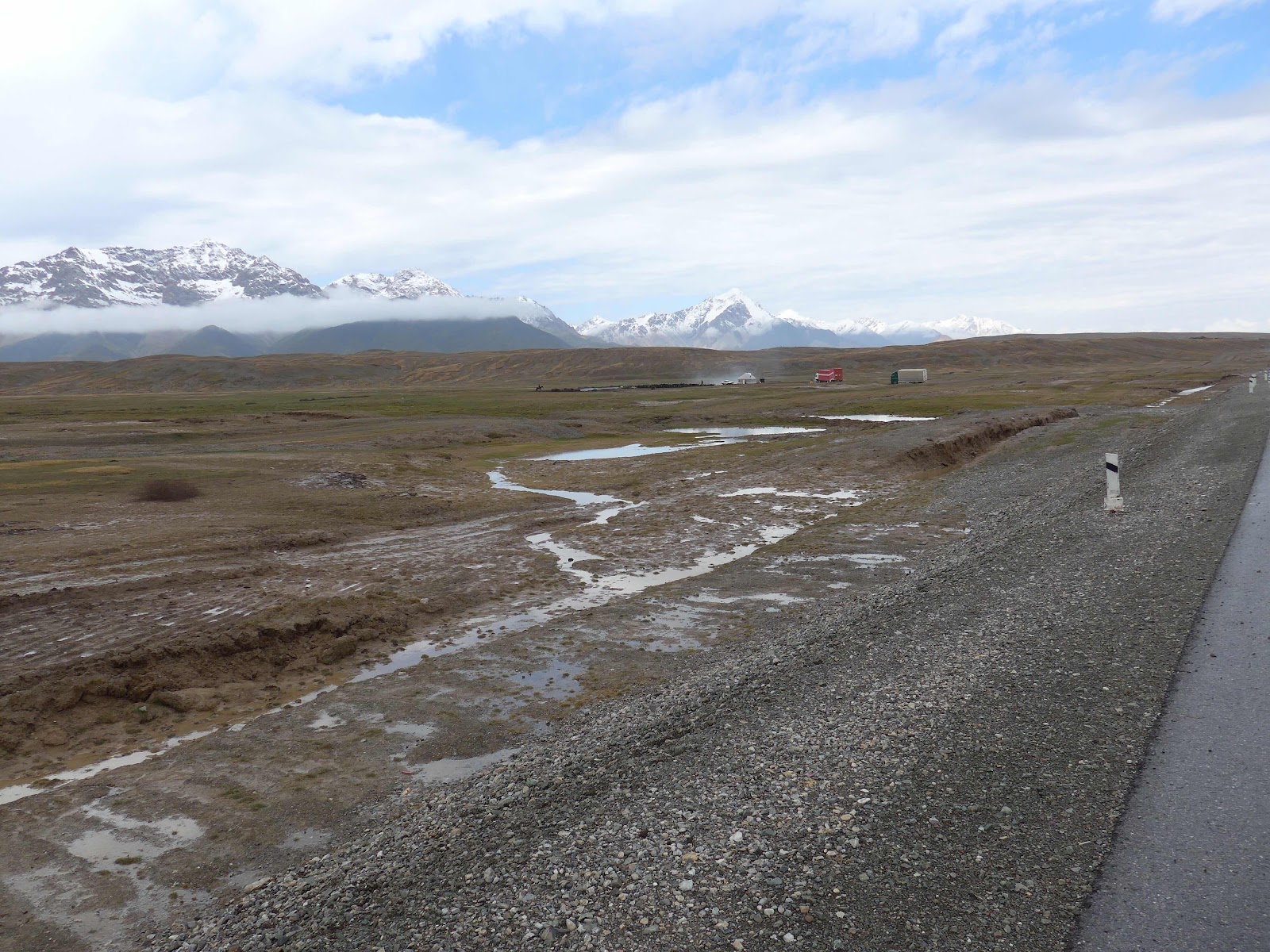 Everyone turned out to wave us off in pouring rain and the rough road didn’t seem any better than yesterday. We hit the tarmac and duly arrived at the first Kyrgyzstan exit point.